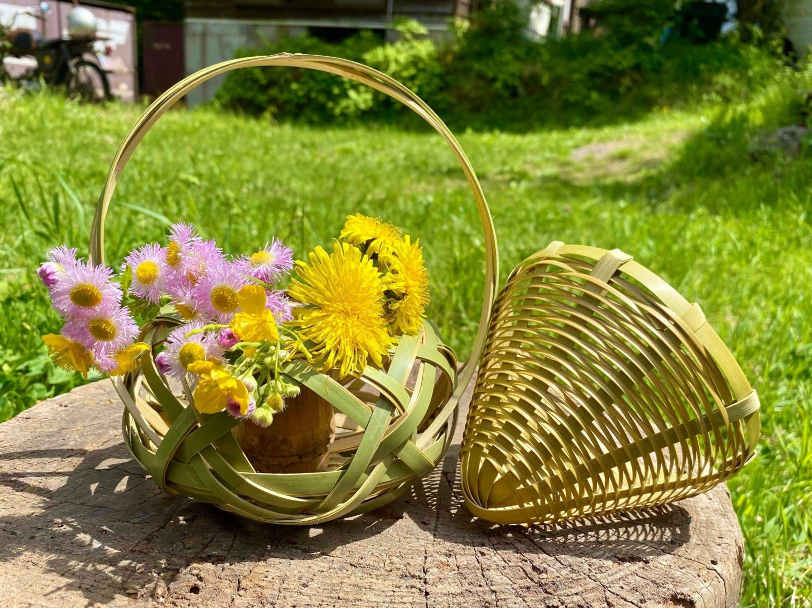 地元の真竹から取った竹ひごで、コーヒードリッパーや野の花かご、星のオーナメントが作れます。コーヒードリッパーはキャンプでも大活躍すること間違いなし。ミラクル野の花かごはなんと7本のひごで編み上げます。星のオーナメントはちょっと北欧風。テントに飾ってね!