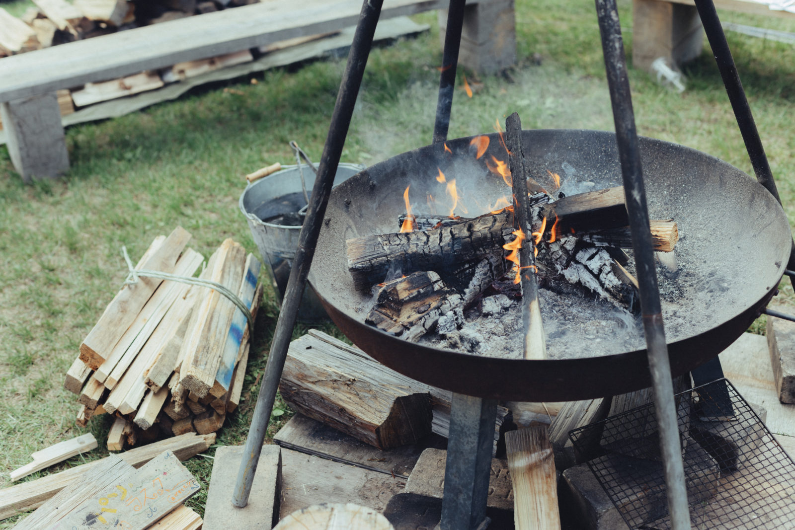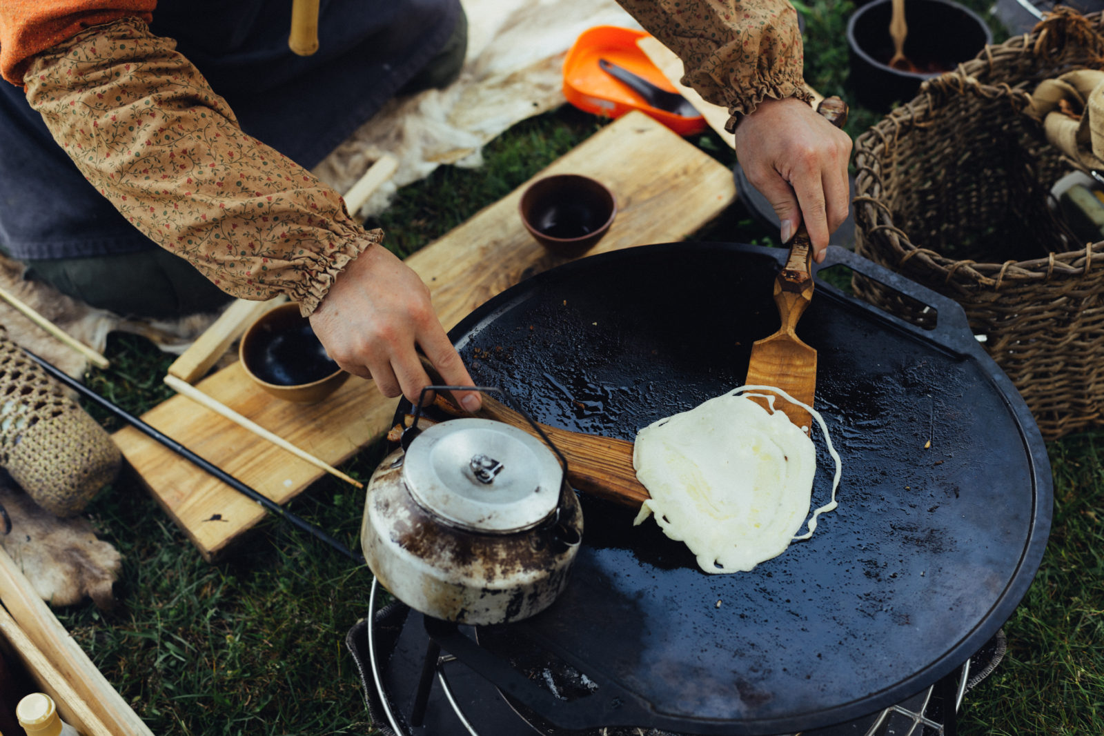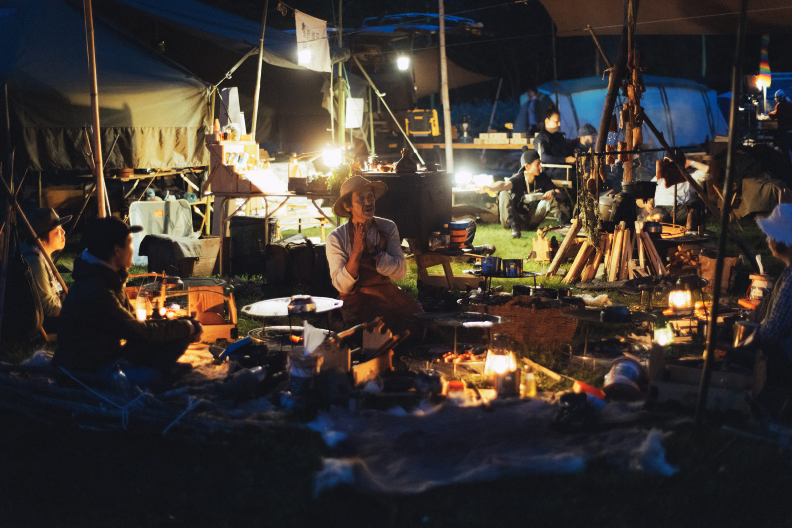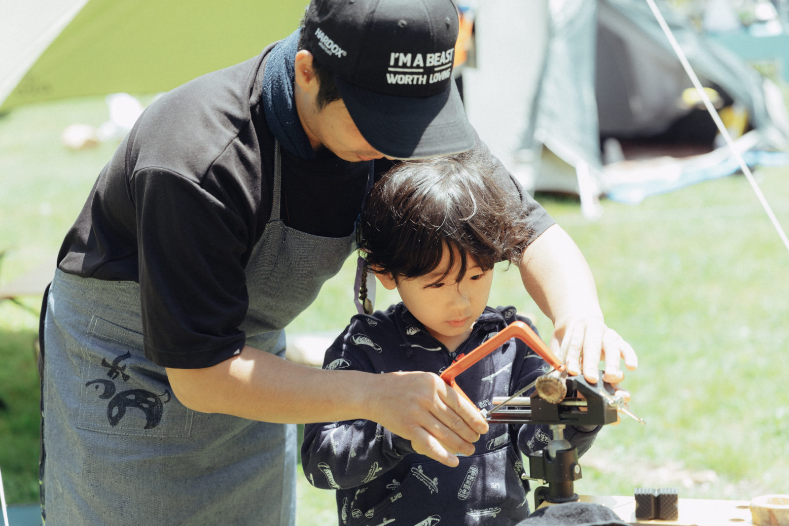 一際大きな幕の下で焚き火を囲む長野 修平(ながの しゅうへい)さんのワークショップは今回も満員御礼。北欧アウトドアの世界を提唱するUPIとコラボし、「モーラナイフ クラフト工房 & 焚火カフェ・クッキング教室」を展開しました。自分で起こした焚き火でクレープやベーコンを焼いたり、コーヒーを入れたりと、隣接するナイフクラフトブースと併せ日常では味わうことのできない極上のオーガニック体験が広がります。